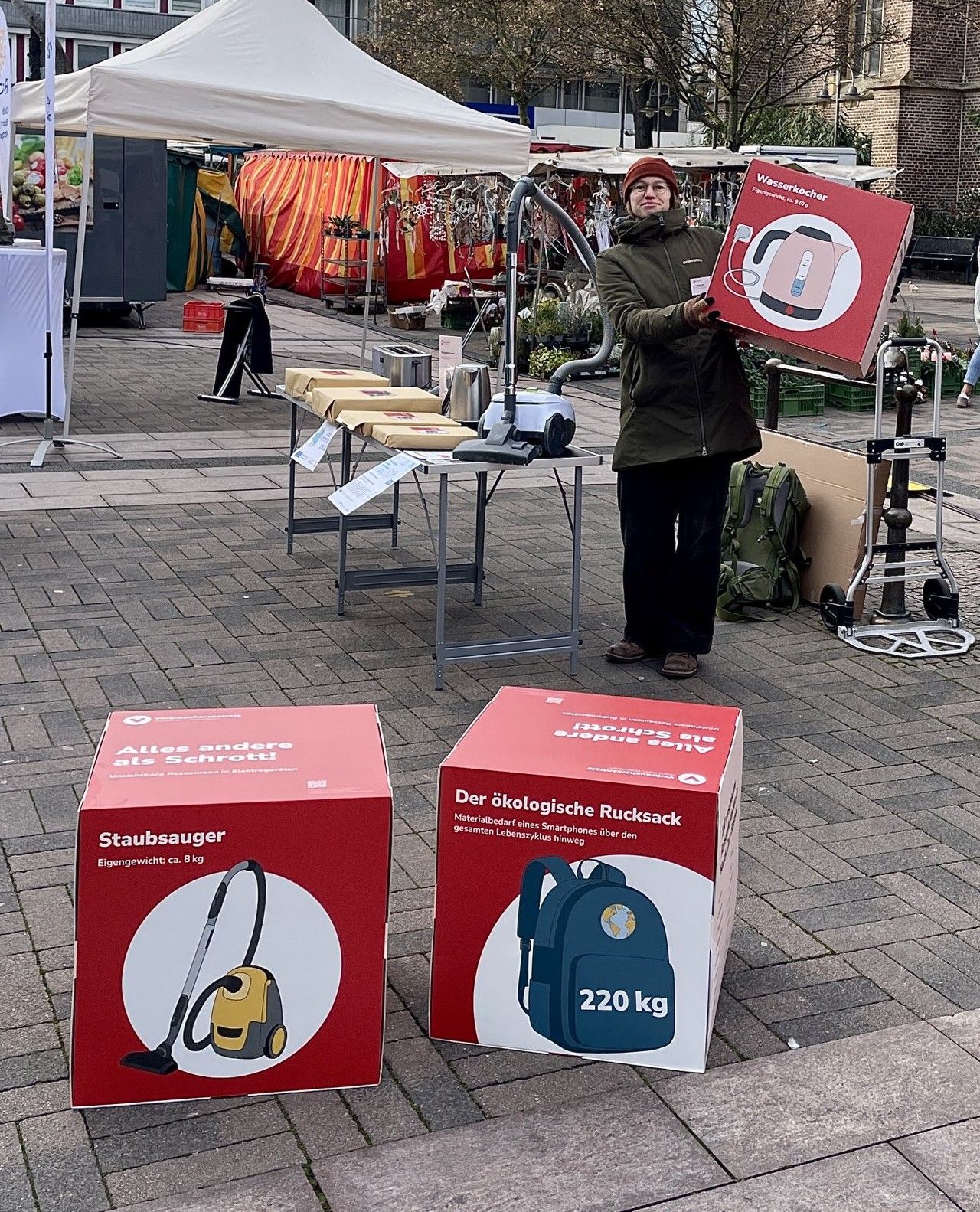 Auf dem Wochenmarkt haben wir die Aktion unserer Kollegin vom Projekt Bottrop.gemeinsam.zirkulär zur Europäischen Woche zur Abfallvermeidung unterstützt. Beim Quiz zum ökologischen Rucksack konnten Interessierte herausfinden, wieviele Rohstoffe ihre Elektrogeräte im Laufe eines Produktlebens so verbrauchen. Eine schöne Aktion, bei der wir direkt mit engagierten Menschen ins Gespräch gekommen sind, die sich je auf ihre eigene Art für Müllvermeidung einsetzen: Dadurch dass sie Geräte lange nutzen oder reparieren, sich im Repair-Café engagieren oder Obst einkochen.