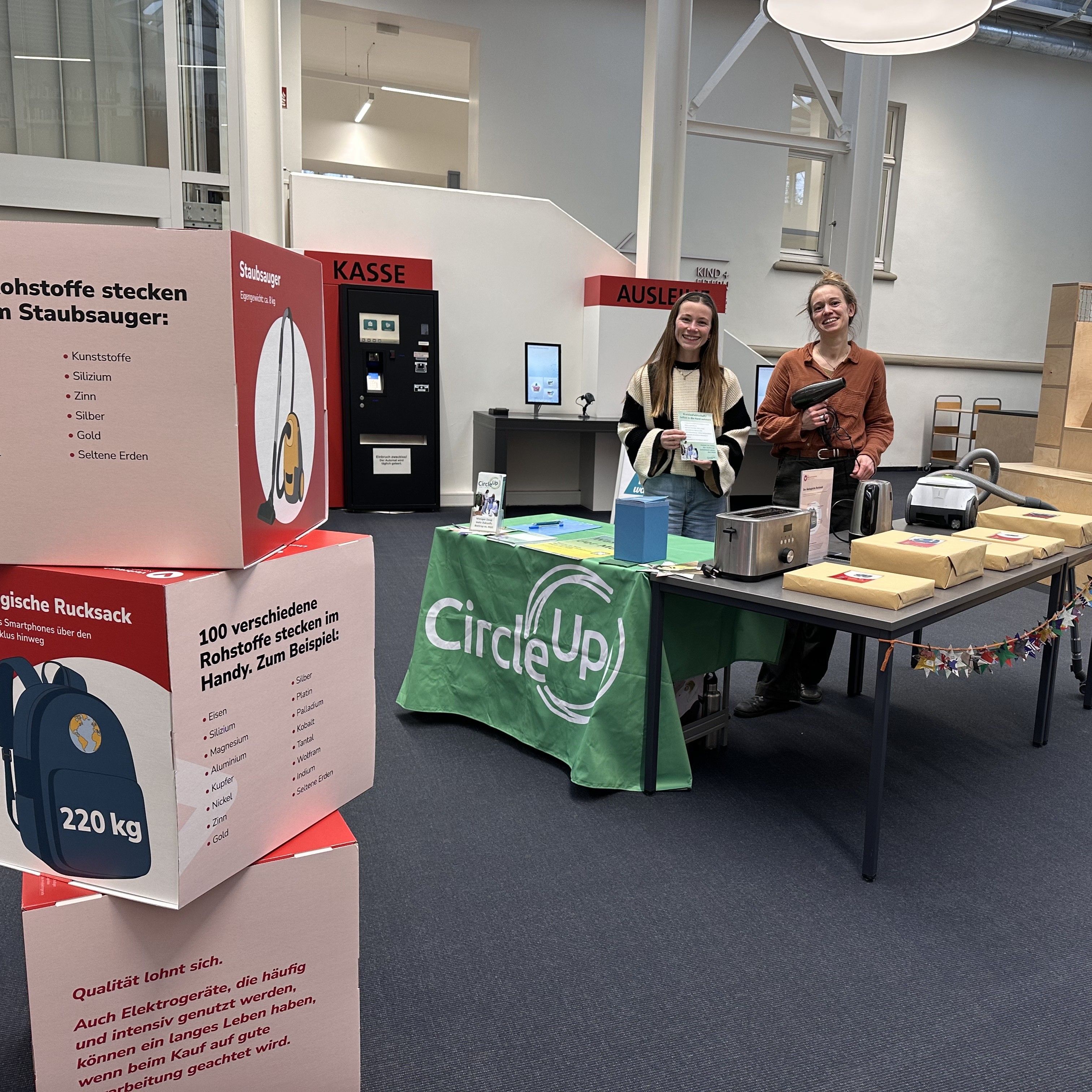 Das Quiz zum ökologischen Rucksack von unseren Kolleg*innen vom Projekt Bottrop.gemeinsam.zirkulär ging in die zweite Runde. Diesmal waren wir gemeinsam in der Lebendigen Bibliothek Bottrop unterwegs, um CircleUp vorzustellen und mit den Menschen aus Bottrop ins Gespräch zu kommen. Eine gemütliche Atmosphäre und interessierte Besucher*Innen gestalteten den Tag sehr erfolgreich für uns. Zwischen lernenden Schüler:innen, zeitschriftenlesenden Erwachsenen und Kindern, die zum ersten mal lernten sich Bücher in der Bibliothek auszuleihen, galt das gemeinsame Interesse dem Zuordnungsquiz des Ökologischen Rucksacks und des CirlcleUp Projektes.